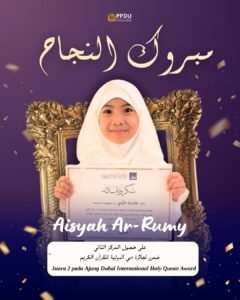 Aisyah Ar-Rumy, siswi SD Tahfidz Al-Qur’an Daarul Ukhuwwah asal Kabupaten Malang, berhasil mengharumkan nama Indonesia dengan meraih Juara 2 di Dubai International Holy Quran Award 2026 pada kategori perempuan, prestasi yang sangat luar biasa bagi hafizah belia di usia 10 tahun.